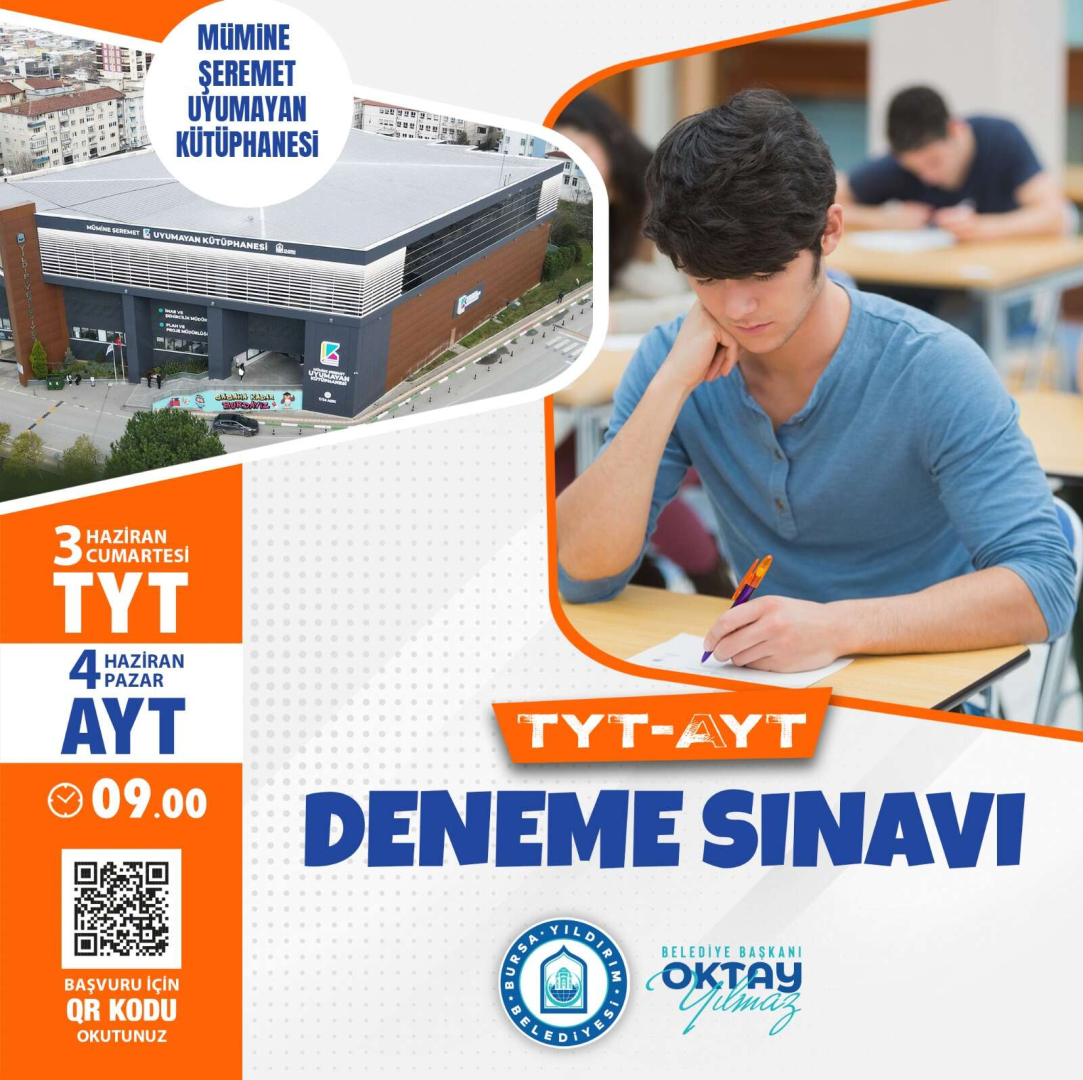 Yıldırım Belediyesi, üniversite sınavlarına hazırlanan gençlerin seviyelerini tespit etmelerini ve sınav sürecini deneyimlemelerini sağlamak için ücretsiz deneme sınavı düzenliyor. Adaylar 3-4 Haziran tarihlerinde Mimar Sinan Uyumayan Kütüphanesi, Mümine Şeremet Uyumayan Kütüphanesi ve Karapınar Gençlik ve Spor Merkezi’nde yapılacak Temel Yeterlilik Sınavı (TYT) ve Alan Yeterlilik Sınavı (AYT) ile kendilerini deneme imkânı bulacak.