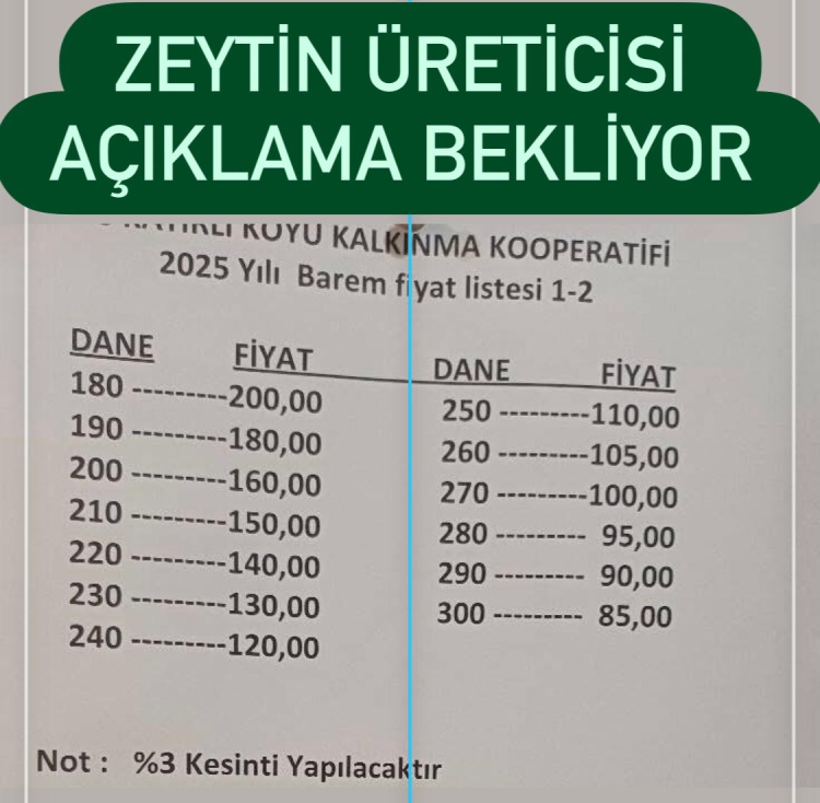 Bursa’da zeytin hasat sezonu başladı ancak Marmarabirlik’in hâlâ alım fiyatlarını açıklamaması üreticilerde endişeye neden oldu. İYİ Parti Bursa İl Başkanı İsmail Kaya, gecikmenin üreticiyi zor durumda bıraktığını belirterek, “Üreticinin hakkı, kooperatiflerin sorumluluğu altındadır” dedi.