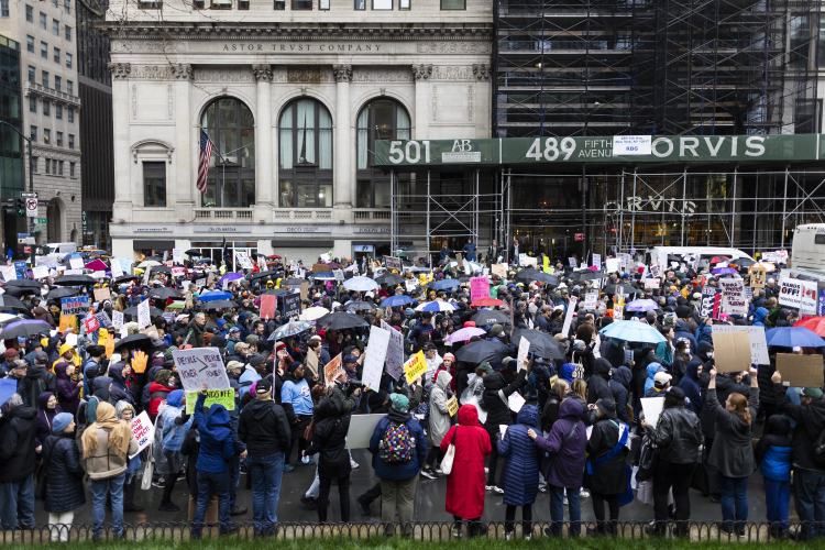 New York’ta da göstericiler, "Güç milyarderlerde değil, halktadır", "Hepimiz özgür olana dek kimse özgür değil", "Musk'ı Mars'a gönderin" yazılı pankartları taşıdı.