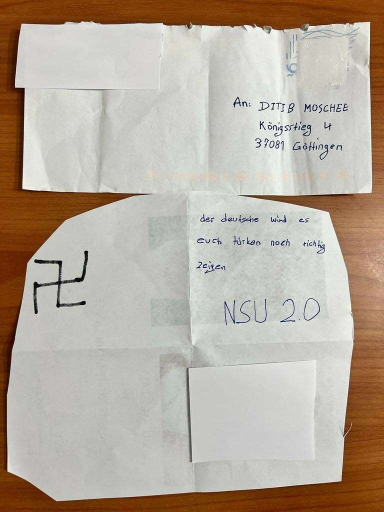 Diyanet İşleri Türk İslam Birliği’ne (DİTİB) bağlı Göttingen Camii’ne ırkçı ifadelerin yer aldığı tehdit mektubu gönderildi. NSU 2.0 imzası ile birlikte Nazi sembolü olan gamalı haçın bulunduğu mektupta, “Bütün İslam’ı öldürün. Artık uzun sürmeyecek. Almanlar size gösterecek” şeklinde ifadeler yer aldı. Göttingen DİTİB Camii Dernek Başkanı Mehmet İbrahimbaş, olayın polisle paylaşıldığını ve suç duyurusunda bulunulduğunu ifade etti.
