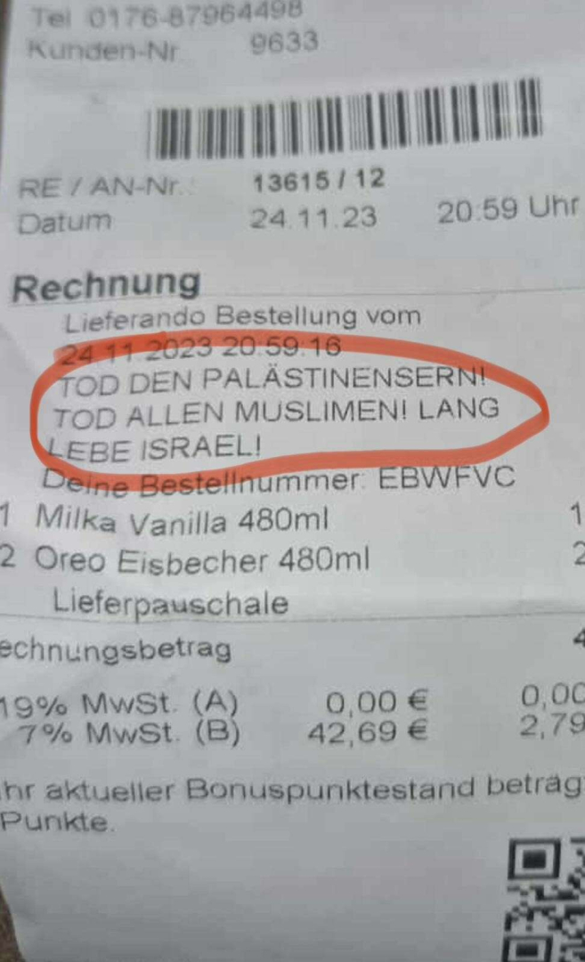 Almanya’nın Bremen eyaletindeki Türk pizza dükkanına internet sitesi üzerinden online sipariş veren Sandra S. isimli şahıs, pizza ismi bölümüne Almanca olarak Filistin karşıtı, İsrail yanlısı ırkçı ifadeler yazmıştı.