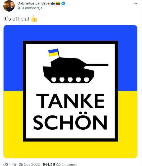 Bakan Landsbergis, üzerinde Ukrayna bayrağı olan bir tank resmi paylaşarak "Tanke schön" ifadesini kullandı.