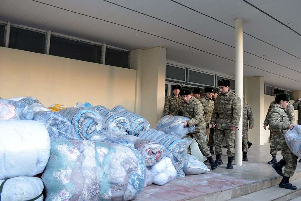 Savunma Bakanlığı'nın organizasyonu ile Azerbaycan ordusu askerleri ve ailelerinin kardeş ülkede depremzedelere yardım etmeleri için ilgili askeri birliklerde yardım toplama noktaları oluşturuldu. Askerler ve aileleri tarafından gönüllü olarak getirilen giysi ve gıda ürünleri, belirlenen noktalarda toplanarak tırlarla Türkiye'ye gönderildi.