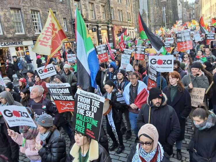 İskoçya’nın başkenti Edinburgh’ta düzenlenen Filistin’e destek yürüyüşünde Gazze Şeridi’ne yönelik saldırılarını sürdüren İsrail’e tepki gösteren binlerce kişi, “Özgür Filistin” sloganları attı.