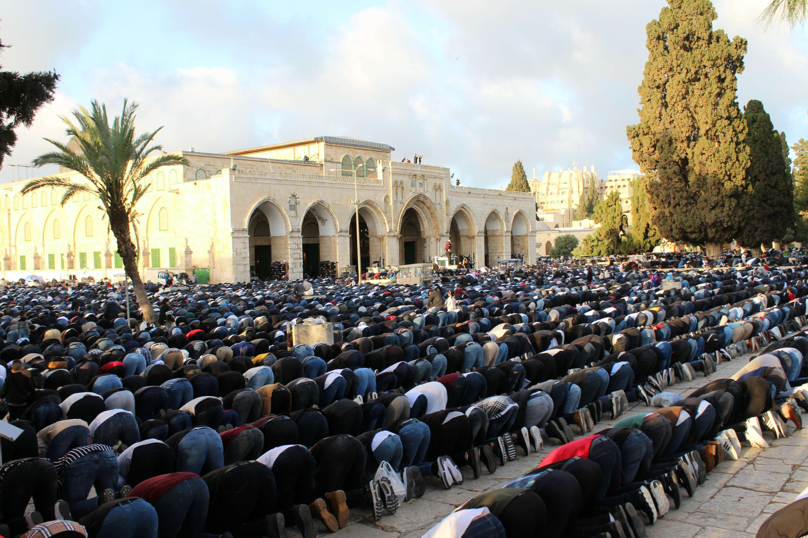 Filistinli ve yabancı Müslümanlar, Ramazan Bayramı'nı kılmak için İslam dininin en kutsal üçüncü mekanı Mescid-i Aksa'ya koştu. Kudüs İslami Vakıflar İdaresi'nden yapılan yazılı açıklamaya göre yaklaşık 120 bin kişi bayram namazını Mescid-i Aksa'da kıldı. Müslümanlar ayrıca tekbir getirerek dua etti.