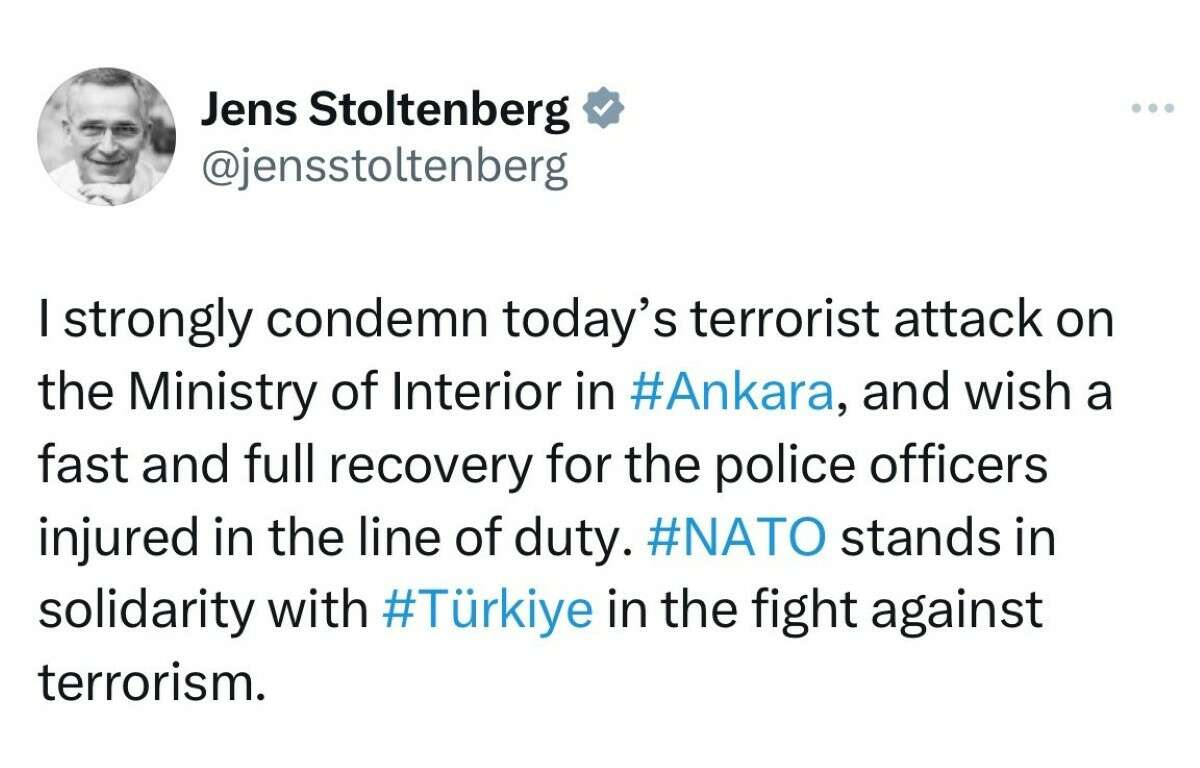 Sosyal medya hesabından açıklama yapan Stoltenberg, “Ankara’da bugün İçişleri Bakanlığı’na düzenlenen terör saldırısını şiddetle kınıyor, görev başında yaralanan polis memurlarına acil şifalar diliyorum. NATO, terörle mücadelede Türkiye ile dayanışma içindedir” ifadelerini kullandı.