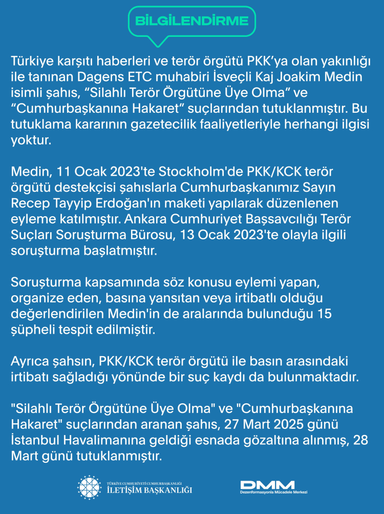 Dagens ETC muhabiri İsveçli Kaj Joakim Medin’in tutuklanmasına ilişkin açıklama İletişim Başkanlığı'ndan geldi.