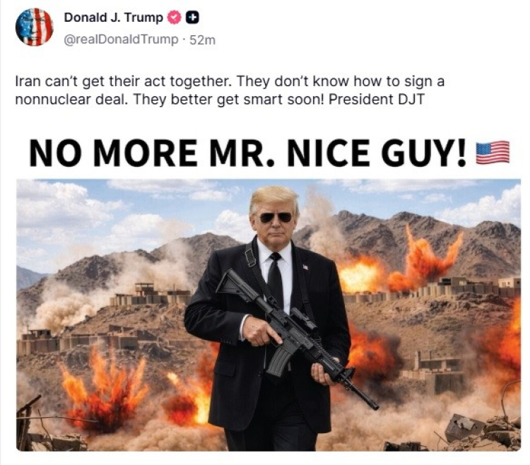 ABD Başkanı Donald Trump, sosyal medya hesabından İran'a yönelik paylaşım yaptı. Trump paylaşımında, "İran bir türlü işleri yoluna koyamıyor. Nükleer olmayan bir anlaşmayı nasıl imzalayacaklarını bilmiyorlar. Bir an önce akıllanmaları gerek" ifadelerini kullandı. Trump ayrıca yapay zekayla oluşturulmuş ve arkasında patlama, elinde silah olan fotoğrafını "Artık iyi adam yok" notuyla paylaştı.