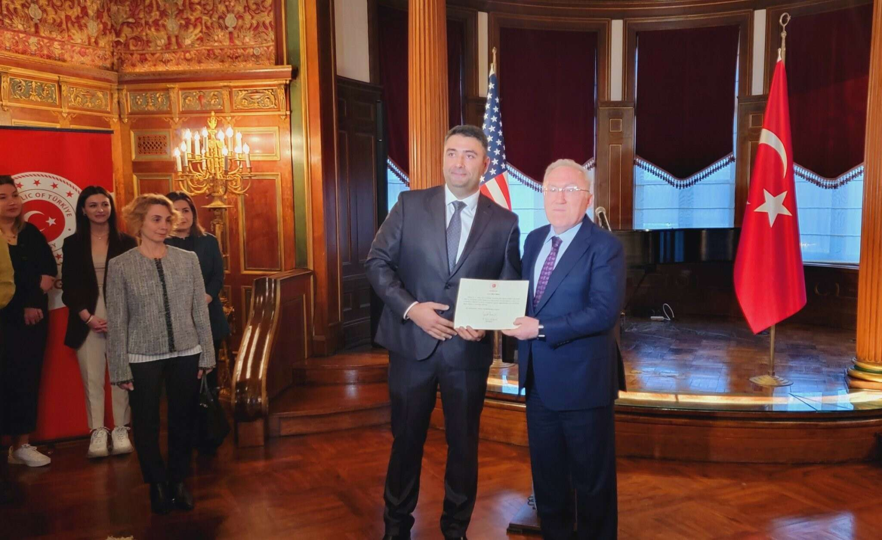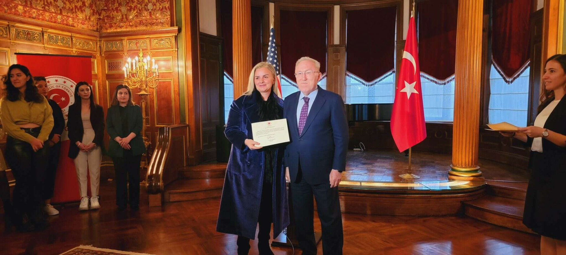 Türkiye'nin Washington Büyükelçisi Hasan Murat Mercan, Türkiye’deki depremzedeler için düzenlenen yardım kampanyasında çalışan gönüllülere teşekkür belgesi verdi.