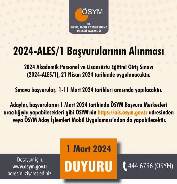 Ölçme, Seçme ve Yerleştirme Merkezi (ÖSYM) Başkanlığından yapılan duyuruya göre, 2024-ALES/1 başvuruları başladı. Adaylar, başvurularını ÖSYM başvuru merkezleri aracılığıyla yapabilecekleri gibi ÖSYM'nin https://ais.osym.gov.tr adresinden veya ÖSYM aday işlemleri mobil uygulamasından da yapabilecek. Sınav ise 21 Nisan 2024’te gerçekleştirilecek.