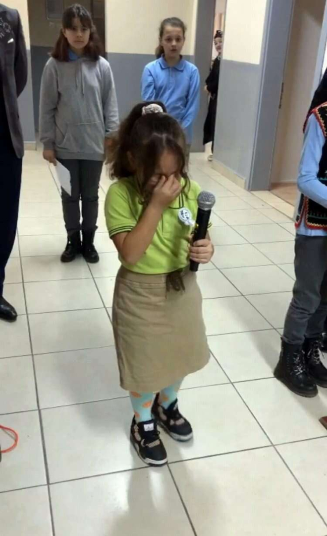 Şiiri gözyaşlarıyla okuyan minik Sümeyye Önal, “Neden ağladığımı sorarsanız, duygulandım ve kalbimizde yaşadığını hissettim. Vatanı kurdu Atatürk, düşmanlardan bizi korudu. Aramızdan gittiğini hissettim ve o yüzden duygulandım” şeklinde konuştu.