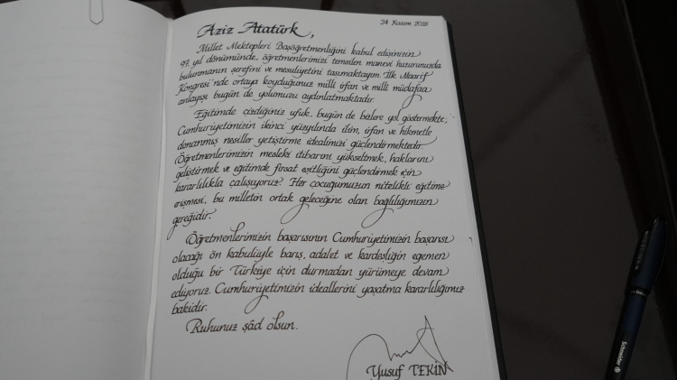 "Aziz Atatürk, Millet Mektepleri Başöğretmenliğini kabul edişinizin 97'nci yıl dönümünde, öğretmenlerimizi temsilen manevi huzurunuzda bulunmanın şerefini ve mesuliyetini taşımaktayım. İlk Maarif Kongresi'nde ortaya koyduğunuz milli irfan ve milli müdafaa anlayışı bugün de yolumuzu aydınlatmaktadır. Eğitimde çizdiğiniz ufuk, bugün de bizlere yol göstermekte; Cumhuriyetimizin ikinci yüzyılında ilim, ifan ve hikmetle donanmış nesiller yetiştirme idealimizi güçlendirmektedir. Öğretmenlerimizin mesleki itibarını yükseltmek, haklarını geliştirmek ve eğitimde fırsat eşitliğini güçlendirmek için kararlılıkla çalışıyoruz. Her çocuğumuzun nitelikli eğitime erişmesi, bu milletin ortak geleceğine olan bağlılığımızın gereğidir. Öğretmenlerimizin başarısının Cumhuriyetimizin başarısı olacağı ön kabulüyle barış, adalet ve kardeşliğin egemen olduğu bir Türkiye için durmadan yürümeye devam ediyoruz. Cumhuriyetimizin ideallerini yaşatma kararlılığımız bakidir. Ruhunuz şad olsun."