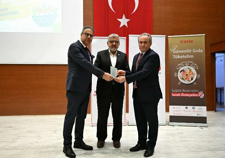 Çocukların güvenilir gıdalarla dengeli ve sağlıklı beslenmesini sağlamak ve israfın azaltılmasına destek olmak amacıyla BTSO öncülüğünde hayata geçirilen “Güvenilir Gıda Tüketelim- Sağlıklı Beslenelim, İsrafı Önleyelim” projesi Şehit Ömer Halisdemir Mesleki ve Teknik Anadolu Lisesi Konferans Salonu’ndaki açılış toplantısıyla başladı. Programa BTSO Yönetim Kurulu Üyesi Hakan Batmaz, BTSO Gıda ve Paketli Ürünler Konseyi Başkanı Burhan Sayılgan, Bursa İl Milli Eğitim Müdürü Dr. Ahmet Alireisoğlu, Bursa İl Tarım ve Orman Müdürü İbrahim Acar, Bursa İl Sağlık Müdürlüğü Halk Sağlığı Hizmetleri Başkan Yardımcısı Dr. Yunuz Arslan, BTSO meclis ve komite üyeleri ile öğretmenler ve çok sayıda öğrenci katıldı.