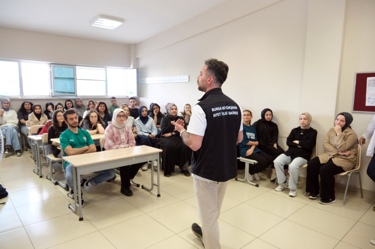 Bursa Büyükşehir Belediyesi tarafından gençlerde afet bilinci oluşturmak amacıyla BUSMEK bünyesindeki YKS hazırlık kursu öğrencilerine afet farkındalık eğitimi verildi.