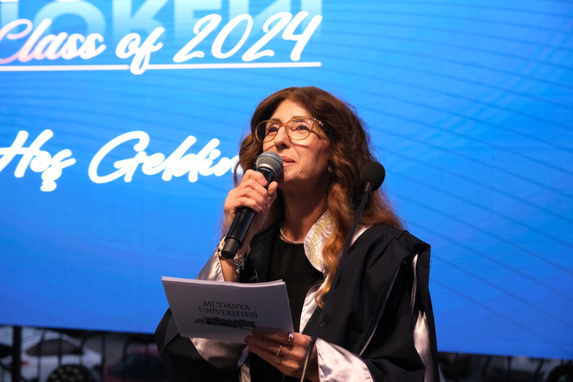 “Bugün meslek yüksekokulumuzun ülkemize kazandıracağı, mesleğinde öncü gençleri gururla uğurlamak için bir aradayız ve tarihi bir ana da tanıklık ediyoruz. Sevgili mezunlarımız. Eğitim hayatınızdaki önemli dönüm noktalarından olan üniversite eğitiminizi başarıyla tamamladınız. Kaydolduğunuz gün dün gibi aklımda. Sizleri yeni yaşamlarınıza uğurlarken hissettiğiniz coşku ve heyecanı tüm kalbimle paylaşıyorum. Bana meslek hayatımın en keyifli son iki yılını yaşattınız. Mesleki eğitimlere gittiğiniz kurumlardan, sorumluluk bilinciniz, öğrenme azminiz, mesleğinize olan yaklaşımınız ile övgü dolu geri bildirimler aldık. Her birinizle ayrı ayrı gurur duyduğumuzu ve gönül rahatlığı ile sizleri uğurladığımızı bilmenizi isterim. Önünüzde kendiniz, aileniz ve ülkemize karşı sorumluluklarınızın olduğu bilinciyle yapacağınız daha çok şey var. Her son yeni bir başlangıçtır bilinciyle kariyer basamaklarını hızla tırmanacağınıza olan inancımız tamdır. Bu süreçte elde edeceğiniz başarı ve toplumsal katkı siz ve aileniz kadar Mudanya Üniversitesi’ni de yüceltecek ve bizleri onurlandıracaktır. Mudanya Üniversitenin ilk mezunlarından olmanın ayrıcalığı ile sizden sonra mezun olacak arkadaşlarınıza el vermeyi, birbirinize destek olmayı, koruyup kollamayı sakın unutmayın.”