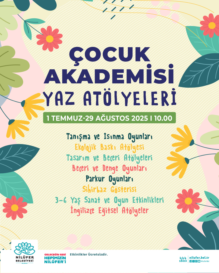 Nilüfer Belediyesi’nin çocukların yaz tatilini daha verimli ve keyifli geçirmesi amacıyla düzenlediği “Çocuk Akademisi Yaz Atölyeleri”, bu yıl 1 Temmuz’dan itibaren 24 farklı mahallede çocuklarla buluşacak.