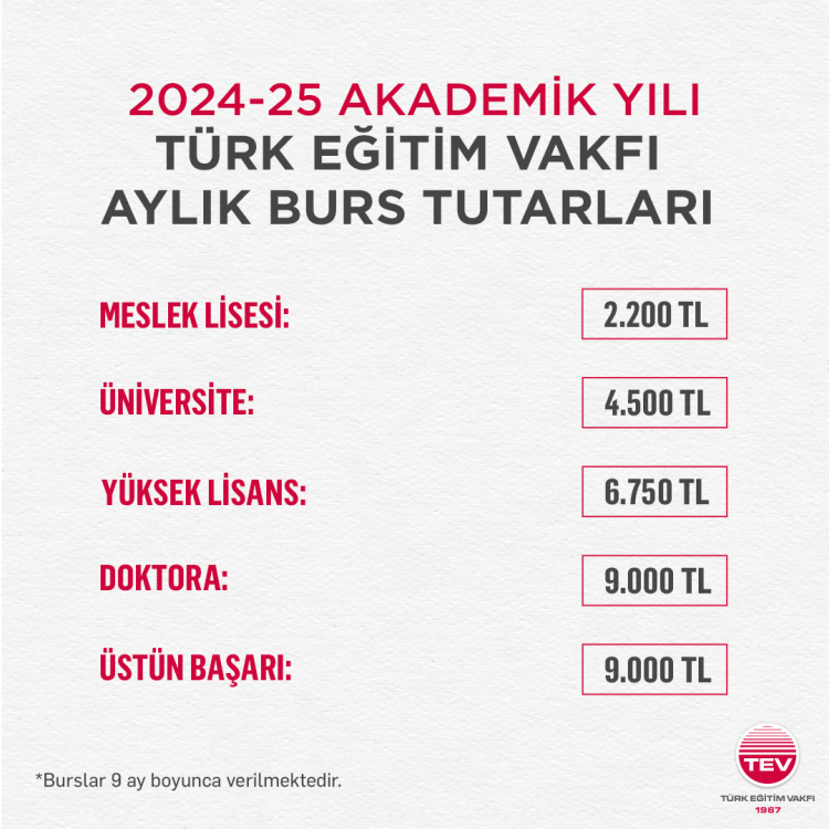 2024-2025 AKADEMİK YILI TEV AYLIK BURS TUTARLARI
