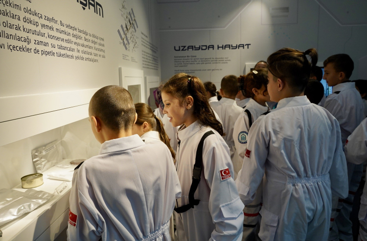 Çocuk Üniversitesi'nde minikler, astronot kıyafetleri giyerek uzay ve astronomi temalı sergi alanında bir astronotun 24 saatini gözlemliyor.