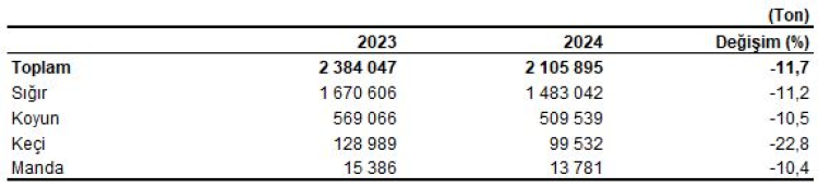 Sığır eti üretimi yüzde 11,2 azalarak 1 milyon 483 bin 42 ton, koyun eti yüzde 10,5 azalarak 509 bin 539 ton, keçi eti yüzde 22,8 azalarak 99 bin 532 ton, manda eti ise yüzde 10,4 azalarak 13 bin 781 ton oldu.