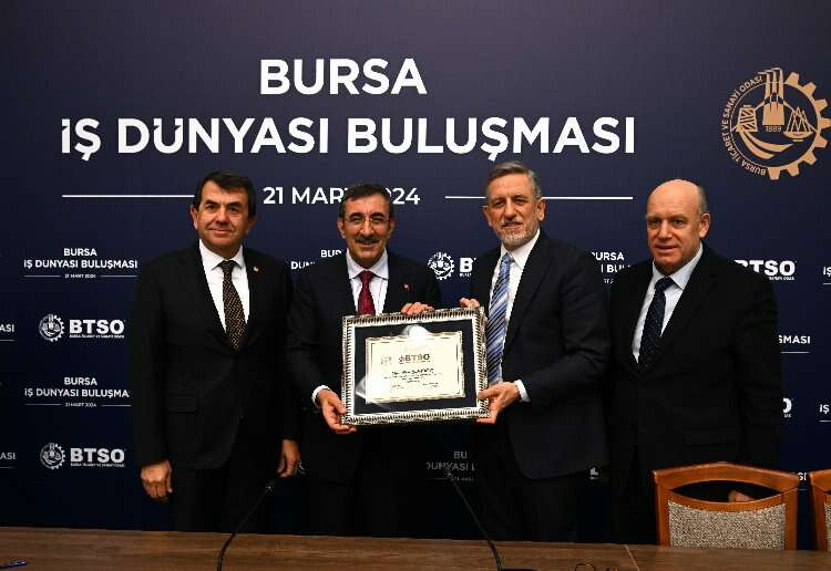 Bursa Ticaret ve Sanayi Odası tarafından organize edilen iş dünyası buluşmasına katılan Cumhurbaşkanı Yardımcısı Cevdet Yılmaz, dünyanın çok iyi bir dönemden geçmediğini söyledi. Yılmaz, “Pandemi sonrası yaşanan olumsuzlar, dünya büyümesi ve ticareti, tarihe ortalamaların altında seyrediyor. Geçen yıl dünya ekonomisi yüzde 3 büyüdü. Türkiye ekonomisine baktığımızda dünyadaki bu olumsuz konjonktüre rağmen, geçen yıl tarihimizin en büyük afetini, deprem afetini yaşamamıza rağmen, yine kuzeyimizde, güneyimizde ticareti, özellikle enerji fiyatları, başka birtakım ekonomik faaliyetleri olumsuz etkileyen jeopolitik gelişmelere rağmen geçen yılı yüzde 4,5 büyümeyle kapattık. Dünyanın 1,5 puan üzerinde bir büyüme performansı gösterdik. İlk defa ülkemiz trilyon dolarlık ekonomiler ligine girmiş olduk. Geçen yıl 1 trilyon 119 milyar dolarlık bir ekonomik büyüklükle 2023’ü kapatmış olduk. Kişi başına gelirimiz ise, 13 bin 110 dolar seviyesine ulaştı. Bu da bizim için yine tarihsel, yüksek bir kişi başına nominal dolar bazında gelir düzeyidir. Bu rakamlarla dolar bazında 17., satın alma gücü kalitesine göre 11. büyük ekonomik olduğunuzu belirtmek isterim. Yılın son çeyreğindeki büyüme rakamlarını analiz ettiğimizde sevindirici bazı gelişmeler görüyoruz. Bir defa 2023’ün 4’üncü çeyreğinde sabit sermaye yatırımlarının yüzde 10,7 olması, yatırımların artmış olması olumlu bir göstergedir. Yine makine teçhizat yatırımlarındaki artış yüzde 14 seviyelerindedir. Bu da aslında sanayimizin gücünü ortaya koyan geleceğe dönük potansiyel büyümemizi kuvvetlendiren önemlidir” dedi.