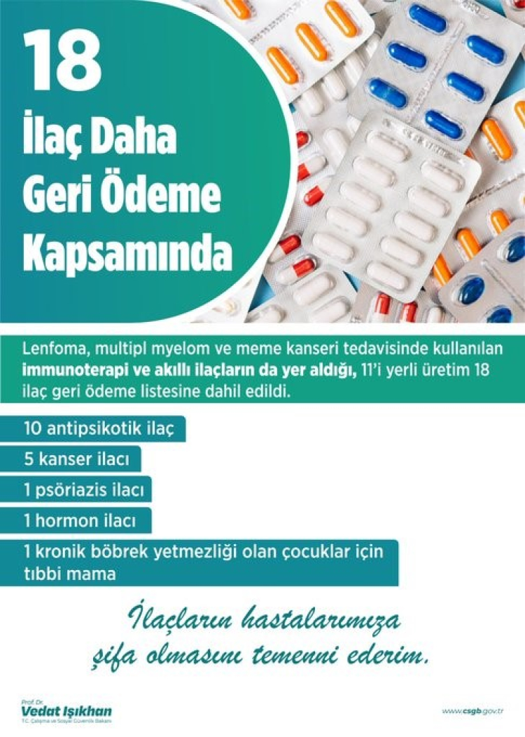 Çalışma ve Sosyal Güvenlik Bakanı Vedat Işıkhan, “Sosyal Güvenlik Kurumumuzun Bedeli Ödenecek İlaçlar Listesi’nde yapılan düzenleme ile 11’i yerli üretim olmak üzere 18 ilacı daha geri ödeme listesine dahil ettik” dedi.