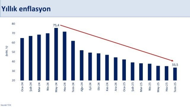 "Enflasyon 44 ayın en düşük seviyesinde. Aylık enflasyon temmuzda geçici ve dönemsel etkilerle yüzde 2,06 gerçekleşirken yıllık enflasyon son 12 ayda 28,3 puan düşüşle yüzde 33,5’e geriledi. Yıllık gıda enflasyonu yüzde 28, temel mal enflasyonu yüzde 20,7 oldu. Hizmet enflasyonu üç yılı aşkın sürenin ardından ilk kez yüzde 50’nin altına indi. Dezenflasyon süreci hedeflerimiz doğrultusunda ilerlemektedir.