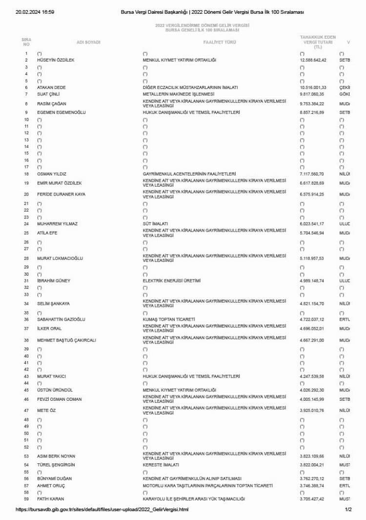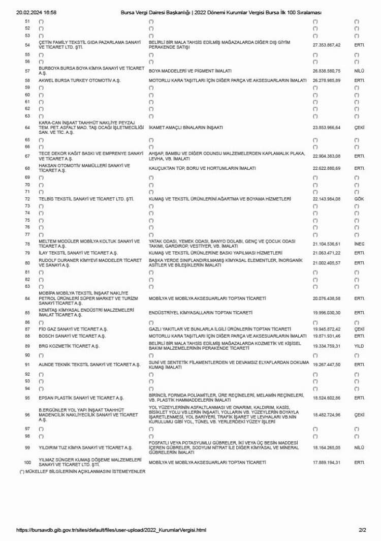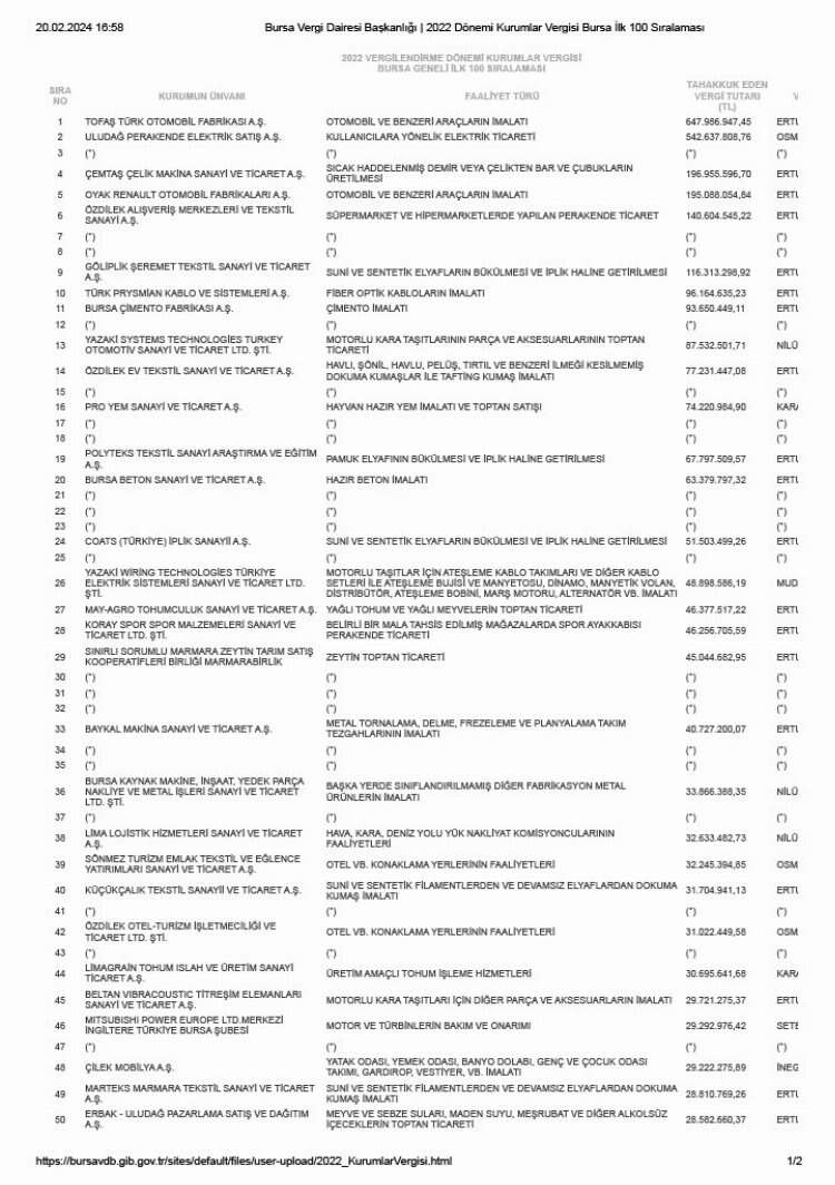 Kurumlar vergisi mükellefleri arasında Tofaş Türk Otomobil Fabrikası A.Ş. 647 milyon 986 bin 947,45 TL. vergi ile 1. sırada yer alırken, Uludağ Perakende Elektrik Satış A. Ş. 542 milyon 637 bin 808,76 TL. vergi ile 2., Çemtaş Çelik Makine Sanayi ve Ticaret A.Ş. 196 milyon 955 bin 596,70 TL vergi ile 4. sırada yer aldı. Listenin 3. sırasında yer alan mükellef bilgilerinin açıklanmasını istemedi.