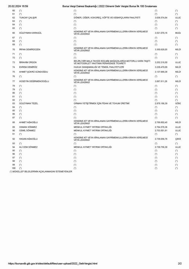 Gelir vergisi ilk 100 sıralaması