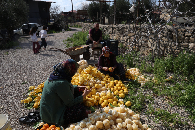 Kozan ilçesine bağlı Turunçlu Mahallesi'nde kadınlar, dalında kalan ve dökülen limon ile turunçların kabuklarını imece usulü soyarak değerlendiriyor. Her yıl bahar ayında toplanarak meyvelerin kabuklarını soyan kadınlar, kuruttukları kabuklarla ve turunçtan elde ettikleri ekşi ile ev ekonomisine katkı sağlıyor.
