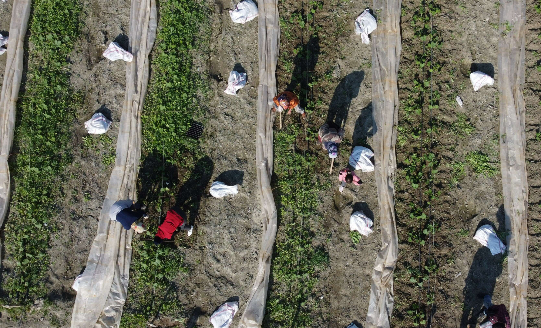 Tarlada çalışanlardan Miyase Aksu ise, "Yaşayan, bir şekilde çalışacak. Üretecek, yiyecek, çocuklarına yedirecek. Bir şekilde hayat devam edecek. Depremden sağ çıktık. Bir kayınvalidem korkudan kaçarken ayağını kırdı. Evimiz yıkıldı, sağ salim çıktık çok şükür. Uğraşıp hayata devam etmek zorunda kalıyoruz" ifadelerini kullandı.