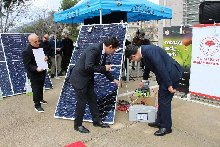 Tarım ve Orman Bakanı İbrahim Yumaklı, "Yaylalar Aydınlansın, Hayvancılık Canlansın, Sütün Kalitesi Artsın Projesi” kapsamında Amasya Tarım ve Orman İl Müdürlüğünde düzenlenen güneş enerji paneli dağıtım törenine katıldı. Bakan Yumaklı, göçer hayvancılık yapan üreticilere güneş enerji panellerini teslim etti. Ülkenin verimli topraklarını işleyen fedakar üreticileri desteklemek için projeler geliştirildiğini belirten Bakan Yumaklı, “2023 yılında 31 milyar dolara ulaşan gıda ürünleri ihracatımızı 35-40 milyar dolara çıkarmanın gayreti içerisindeyiz” dedi.