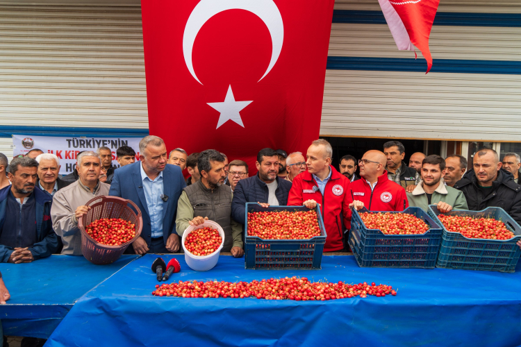 Manisa’nın Şehzadeler ilçesinde erkenci kiraz cinsleri kuzey yarımkürede yetişen ilk kiraz olma özelliğiyle gerek yurt içi gerekse de yurtdışı pazarda önemli bir yere sahip. Nisan ayının sonlarına doğru gelirken, çiftçiler de hasat edilen ilk kirazı pazara yetiştirmek için tatlı bir telaşa girdi. Bu yıl pazara kirazı ilk getiren kiraz üreticisi Yusuf Bakan, düzenlenen açık arttırmayla hasat ettiği kirazı kilogramı 6 bin TL’den kiraz tüccarı Mesut Altıok’a sattı.