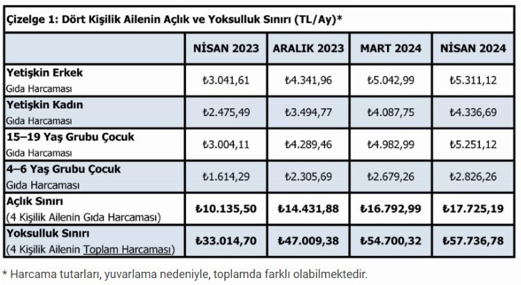 4 kişilik bir ailenin sağlıklı, dengeli ve yeterli beslenebilmesi için yapması gereken aylık gıda harcaması tutarı 17 bin 725 lira 19 kuruş oldu. Yoksulluk sınırını belirleyen gıda harcaması ile giyim, konut (kira, elektrik, su, yakıt), ulaşım, eğitim, sağlık ve benzeri ihtiyaçlar için yapılması zorunlu diğer aylık harcamalarının toplam tutarı da 57 bin 736 lira 78 kuruş olarak açıklandı