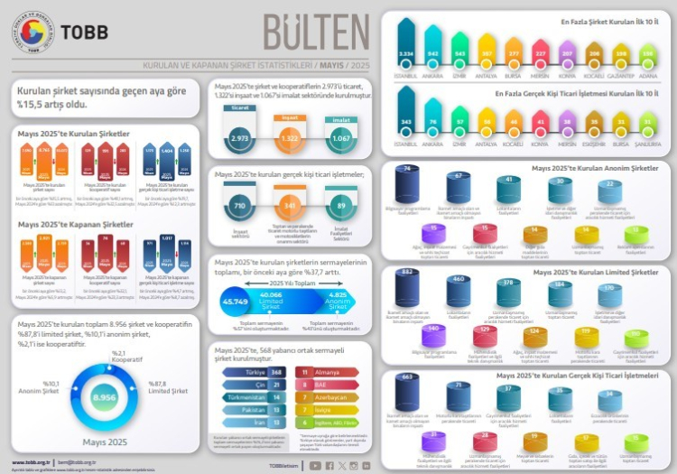 TOBB’un açıkladığı istatistiklere göre 2025 yılında toplam 45 bin 749 şirket ve kooperatif kurulurken, bu dönemde kurulan toplam 40 bin 66 limited şirket, toplam sermayenin yüzde 57’sini, 4 bin 825 anonim şirket ise yüzde 43’ünü oluşturmakta. Mayıs ayında kurulan şirketlerin sermayelerinin toplamı, Nisan ayına göre yüzde 37,7 oranında arttı.