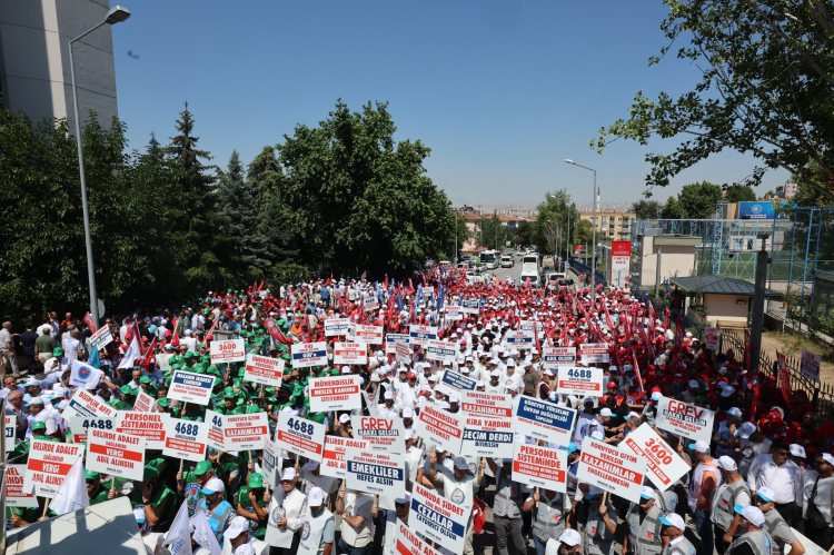 Kamuda yaklaşık 4 milyon memur ve 2 buçuk milyon memur emeklisini kapsayan 8. Dönem Toplu Sözleşme görüşmelerinde takvim işliyor. Ön müzakere toplantılarının ardından Kamu İşveren Heyeti ilk teklifini dün açıklamıştı. Hükümetin 2026 ilk altı ayı için yüzde 10, ikinci altı ayı için 6; 2027 yılı ilk altı ayı için yüzde 4 ve ikici altı ayı için 4 zam teklifi, Memur-Sen ve diğer sendikalar tarafından kabul görmedi. Memur-Sen tarafından 81 ilde eş zamanlı olarak eylem gerçekleştirildi. Ankara'da Çalışma ve Sosyal Güvenlik Bakanlığı önünde düzenlenen eyleme Memur-Sen'e bağlı sendikaların temsilcileri ve üyeleri katıldı.