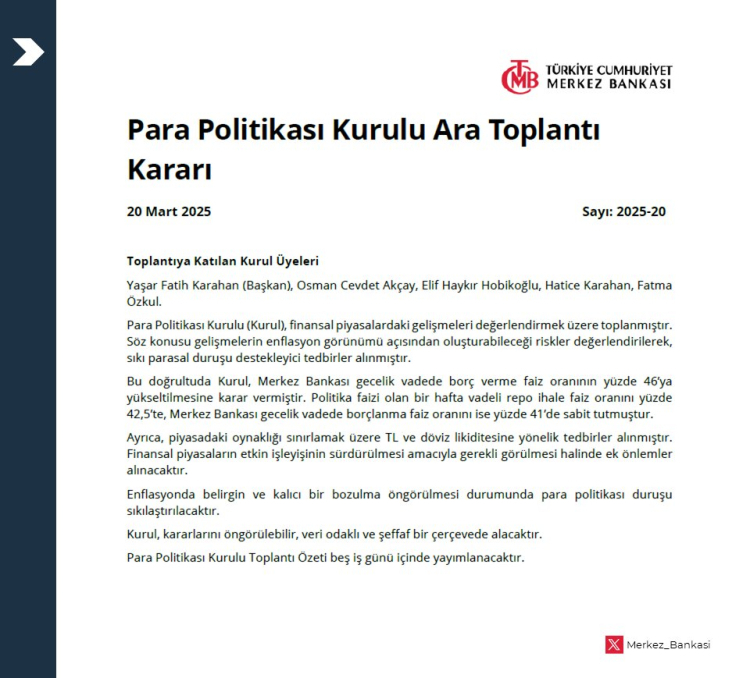 Söz konusu gelişmelerin enflasyon görünümü açısından oluşturabileceği riskler değerlendirilerek, sıkı parasal duruşu destekleyici tedbirler alınırken, bu doğrultuda kurul, Merkez Bankası gecelik vadede borç verme faiz oranının yüzde 46’ya yükseltilmesine karar verdiği duyuruldu.