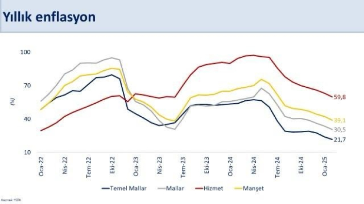 Bakan Şimşek, sosyal medya hesabından yaptığı paylaşımda, "Dokuz aydır gerileyen yıllık enflasyon şubatta yüzde 39,1 gerçekleşti. Temel mallarda yıllık enflasyon geçen yılın aynı ayına göre 32 puan düşüşle yüzde 21,7, hizmet enflasyonu ise 35 puan düşüşle yüzde 59,8 oldu. Dezenflasyon sürecini destekleyen maliye ve gelirler politikaları ile beklentilerdeki iyileşme sayesinde enflasyondaki istikrarlı düşüşün devam etmesini bekliyoruz. Vatandaşlarımızın alım gücünü ve gelir dağılımını kalıcı olarak iyileştirecek olan fiyat istikrarına ulaşmak için politikalarımızı kararlılıkla uygulayacağız" ifadelerine yer verdi.