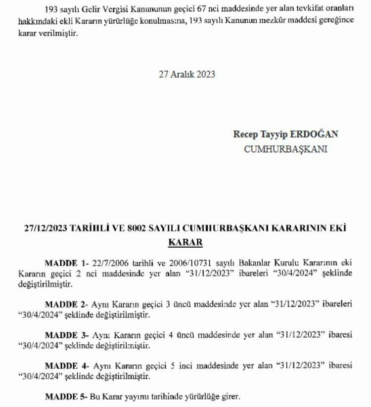 Bankaların ihraç ettiği tahvil ve bonolar ile fon kullanıcısının bankalar olduğu varlık kiralama şirketlerinin ihraç ettiği kira sertifikalarından elde edilen kazanç ve iratlarda, yatırım fonlarından elde edilen gelirlerde, varlığa ve ipoteğe dayalı, ipotek ve varlık teminatlı menkul kıymetlerden elde edilen gelirlerde indirimli gelir stopaj oranı uygulamasının süresi 30 Nisan 2024'e kadar uzatıldı.