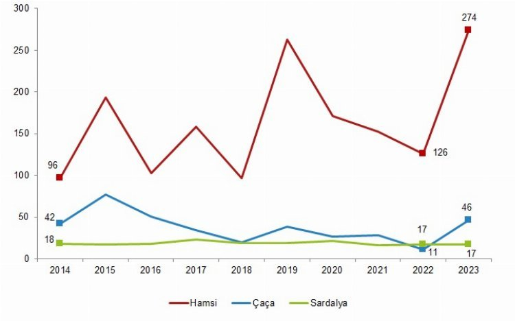 Avlanan deniz balıkları miktarı 387 bin 115 ton olarak gerçekleşti. Avlanan deniz balıklarının türlerine göre dağılımı incelendiğinde, hamsi balığının 273 bin 915 ton ile en yüksek miktarda avlanan balık olduğu görüldü. Hamsi balığını 45 bin 764 ton ile çaça ve 17 bin 311 ton ile sardalya takip etti.