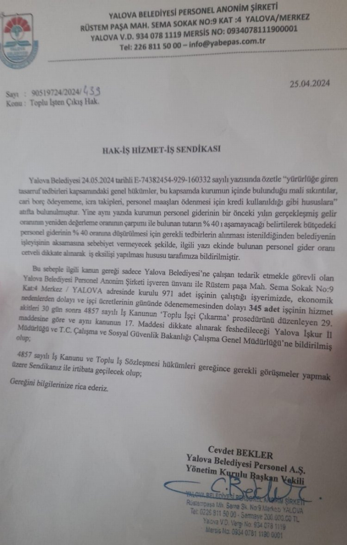 “Yalova Belediyesi, yürürlüğe giren tasarruf tedbirleri çerçevesindeki genel hükümler, bu çerçevede kurumun içinde bulunduğu mali sıkıntılar, cari borç ödeyememe, icra takipleri, personel maaşları ödenmesi için kredi kullanıldığı gibi hususlara’ atıfta bulunulmuştur. Yine aynı yazıda kurumun personel giderinin bir önceki yılın gerçekleşmiş gelir oranının yeniden değerleme oranının çarpımı ile bulunan tutarın yüzde 40’ı aşamayacağı belirtilmiştir. Bütçedeki personel giderinin yüzde 40 oranına düşürülmesi için gerekli tedbirlerin alınması istenildiğinden belediyenin işleyişinin aksamasına sebebiyet vermeyecek şekilde, ilgili yazı ekinde bulunan personel gider oranı cetveli dikkate alınarak iş eksilişi yapılması hususu tarafımıza bildirilmiştir. Bu sebeple ilgili kanun gereği sadece Yalova Belediyesi'ne çalışan tedarik etmekle görevli olan Yalova Belediyesi Personel Anonim Şirketi işveren unvanı ile Rüstem paşa Mah. Sema Sokak No:9 Kat:4 Merkez / Yalova adresinde kurulu 971 adet işçinin çalıştığı işyerimizde, ekonomik sebeplerden dolayı ve işçi ücretlerinin gününde ödenememesinden dolayı 345 adet işçinin hizmet akitleri 30 gün sonra 4857 sayılı İş Kanunun 'Toplu İşçi Çıkarma' prosedürünü düzenleyen 29. maddesine göre ve aynı kanunun 17. Maddesi dikkate alınarak feshedileceği Yalova İş-Kur İl Müdürlüğü ve T.C. Çalışma ve Sosyal Güvenlik Bakanlığı Çalışma Genel Müdürlüğü'ne bildirilmiş olup; 4857 sayılı İş Kanunu ve Toplu İş Sözleşmesi hükümleri gereğince gerekli görüşmeler yapmak üzere sendikanız ile irtibata geçilecek olup, gereğini bilgilerinize rica ederiz."