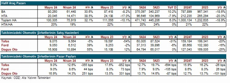 2023’teki rekor seviyelerin ardından daha zorlu bir yıl beklendiğine vurgu yapılan raporda; "HA satışları Nisan ve Mayıs ayındaki yıllık bazdaki daralmaya rağmen 5A24’te, yıllık bazda %6 artarak tarihsel rekor seviyesi olan 471,7 bin seviyesinde gerçekleşti. Haziran ayında 72,0 bin adet hafif araç satışı (HA) tahmin ediyoruz. 2024T'de 1mn adet HA satışı tahmin ediyoruz, bu da yıllık bazda düşüş anlamına geliyor. Haziran ayında aylık satış hacminin 80 binin üzerine çıkması yurt içi talebin beklediğimizden daha güçlü olduğu sinyalini verebilir. Aylık satış hacminin 60 bin adedin altında olması, beklediğimizden daha ciddi bir zayıflamanın da sinyalini verecektir" dedi.