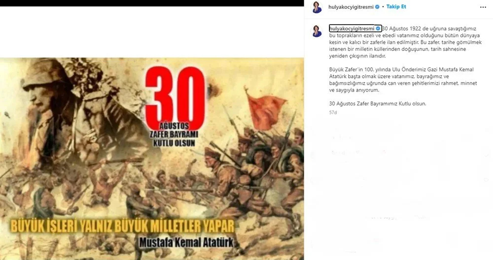 "30 Ağustos Zafer Bayramımızın 100. yıl dönümünü kutluyor, başta Ulu Önder Gazi Mustafa Kemal Atatürk ve silah arkadaşları olmak üzere tüm şehitlerimizi saygı, rahmet ve minnetle anıyorum."