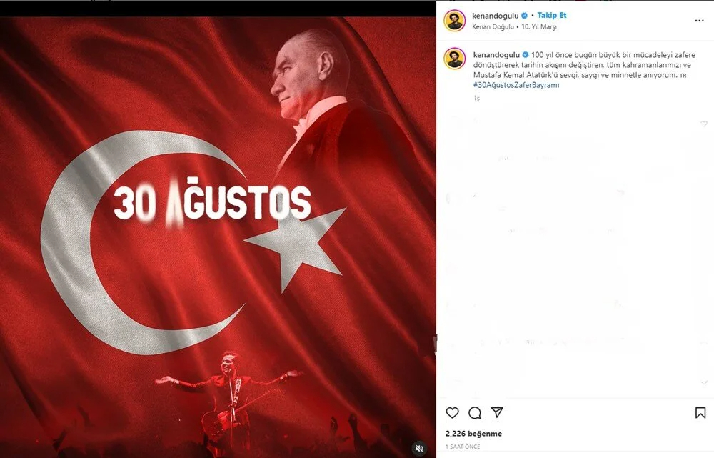 100 yıl önce bugün Mustafa Kemal Atatürk önderliğinde gerçekleşen Büyük Taarruz, Türk ordusunun zaferiyle sonuçlandı. 30 Ağustos Zafer Bayramı'nın yıl dönümünde ünlü isimler duygularını sosyal medyadan paylaştı.