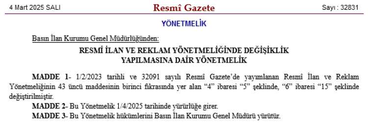 Basın İlan Kurumu'nun Resmi İlan ve Reklam Yönetmeliği'nde Değişiklik Yapılmasına Dair Yönetmelik bugünkü Resmi Gazete'de yayımlandı.