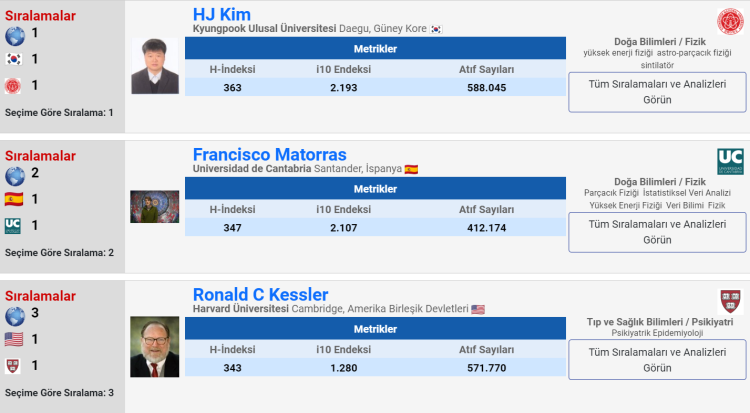 AD Scientific Index tarafından yayınlanan 2025 'Dünya Bilim İnsanı ve Üniversite Sıralaması' sonuçları açıklandı. 'Dünyanın en iyi 100 bilim insanı 2025' listesinde Kyungpook Ulusal Üniversitesi Daegu'dan HJ Kim ilk sırada yer alırken Türk bilim insanları ilk 100'e giremedi