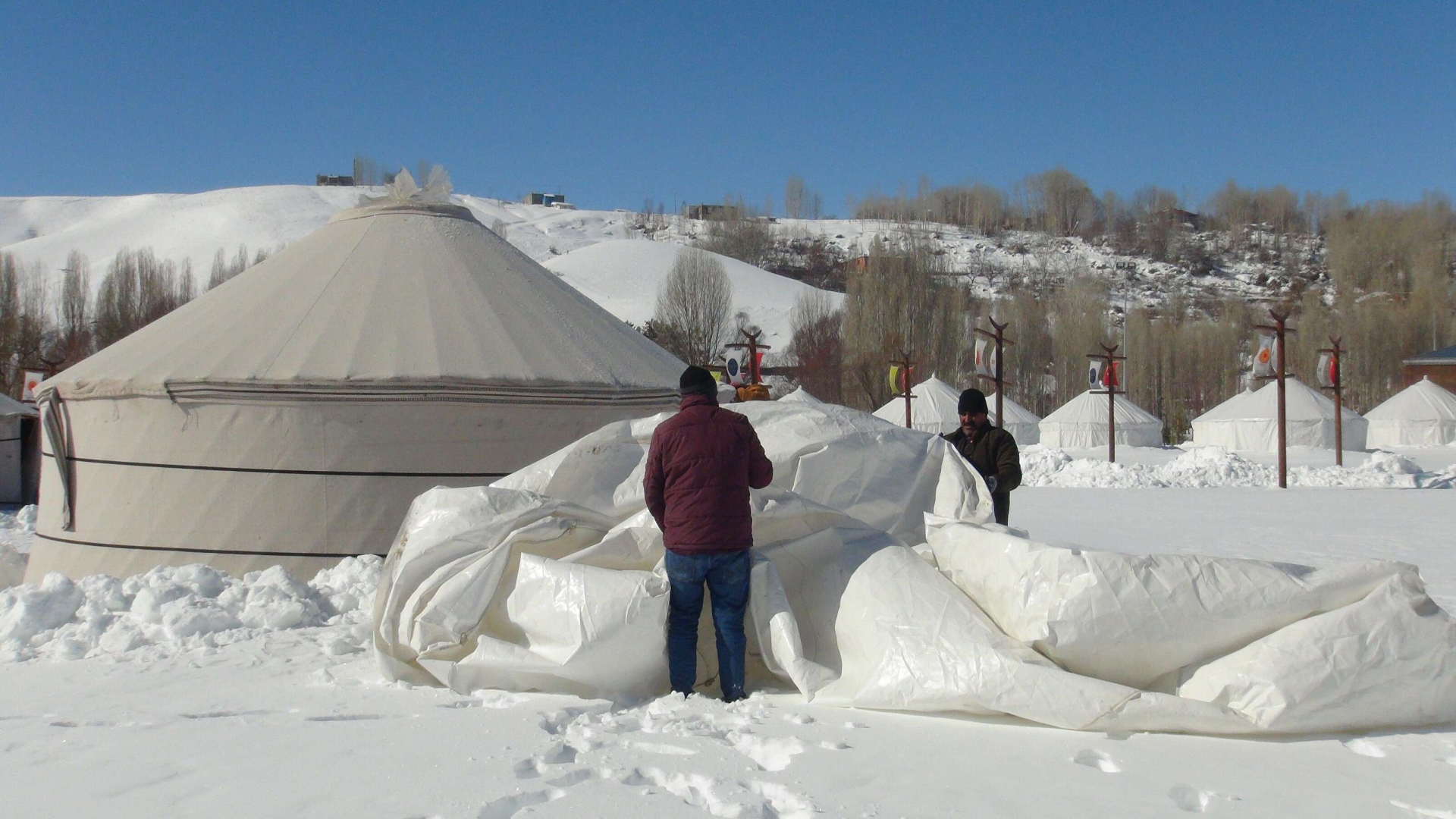 Bitlis'in Ahlat ilçesindeki Millet Bahçesi'nde bulunan ve her yıl 1071 Malazgirt Zaferi kutlamalarında etkinlik çadırı olarak kullanılan çadırlar, depremzede ailelerin kullanımı için sökülmeye başlandı.