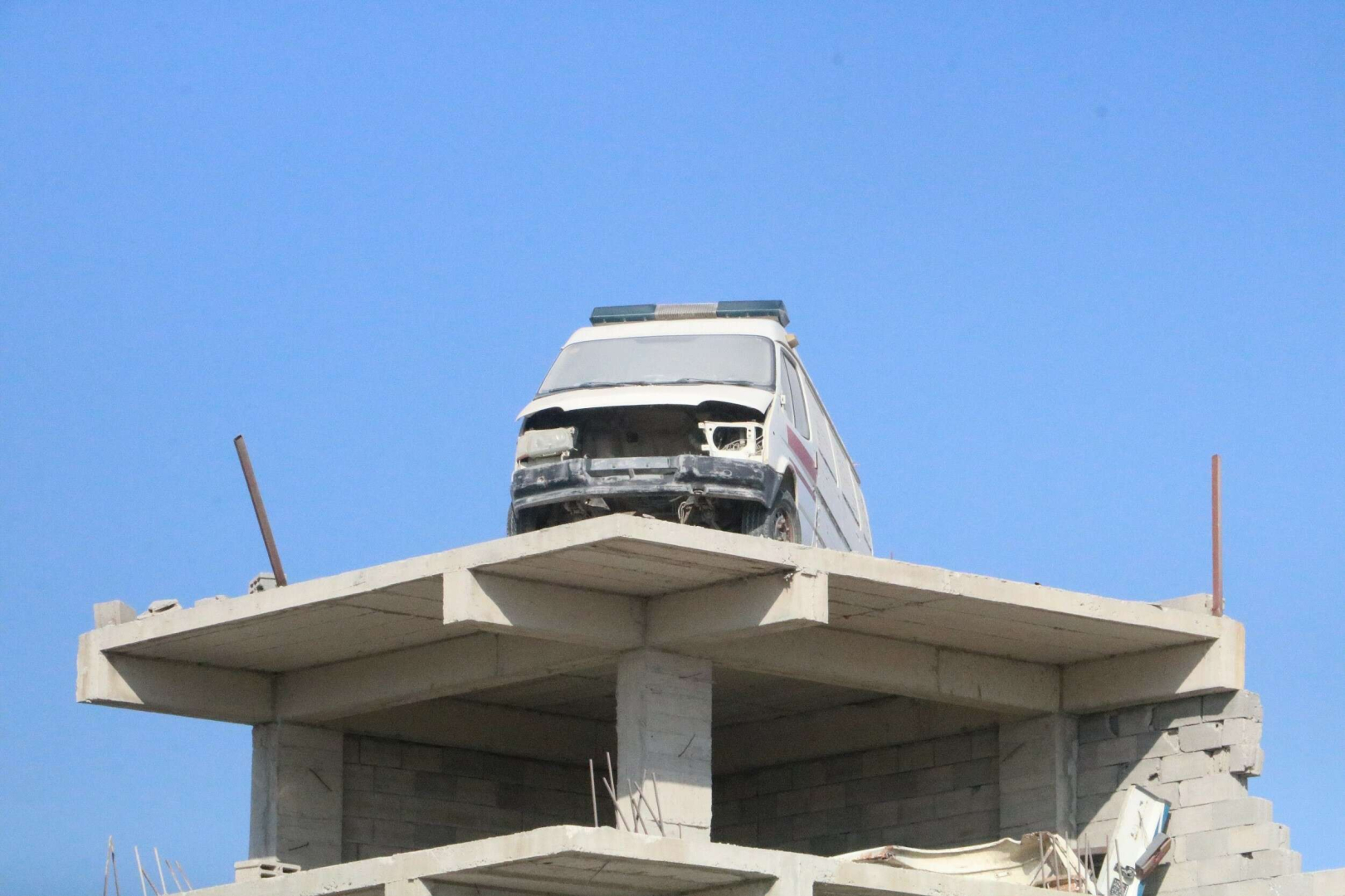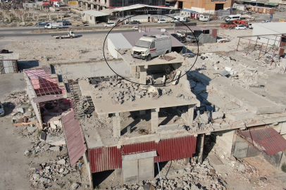 Depremin vurduğu Hatay'da 4 katlı ağır hasarlı iş yerinin çatısına dikkat çekmesi için konulan minibüs, devasa yapıların yerle bir olduğu asrın felaketinde yerinden kıpırdamadı.