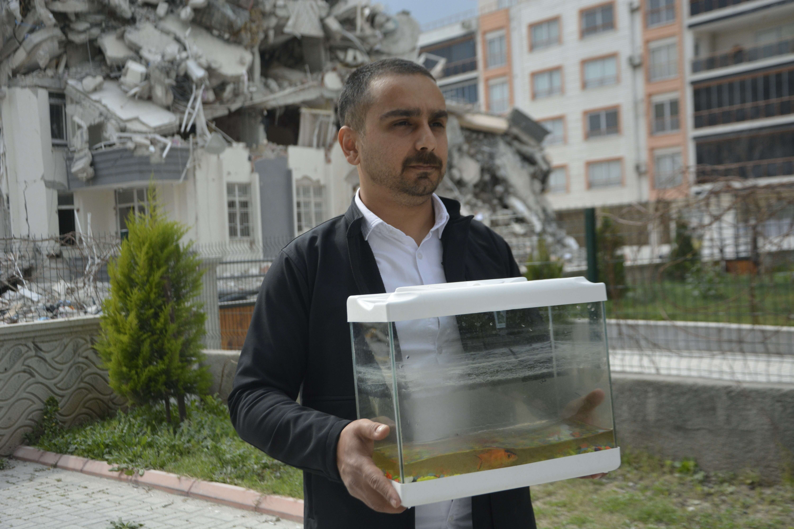 Türkiye'yi yasa boğan Kahramanmaraş depremlerinde Osmaniye’de de binden fazla kişi hayatını kaybetti, çok sayıda bina da ağır hasar aldı. Osmaniye'de depremden en çok etkilenen mahallelerden biri de Esenevler oldu. Esenevler Mahallesi'nde bulunan Doğan Apartmanı da depremde orta hasar aldı. Deprem sonrası apartmanın 5. katındaki dairede kalan 1 çocuklu Akyürek ailesi, panikle kendilerini dışarı attı. Balıkların bulunduğu çocuk odasının ıslak olması nedeniyle anne Merve Nur, eşi Gökhan Akyürek'e balıkların öldüğünü söyledi. 44 gün sonra eve giren Gökhan Akyürek, balıkların fanusta kalan az bir suda yaşadığını görünce hem şaşırdı hem de mutluluk yaşayıp kameraya da kaydetti. Balıkları alan Akyürek, onları yaşadıkları yere götürdü. "TÜYLERİM DİKEN DİKEN OLDU"