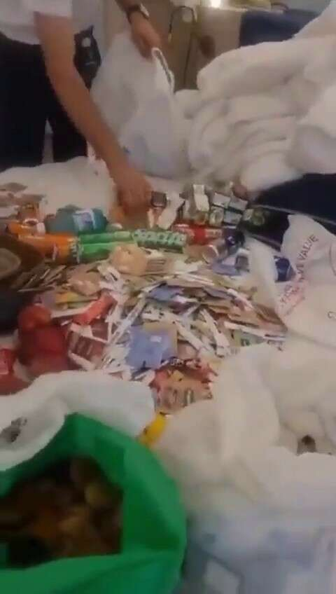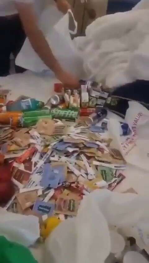 Odadaki malzemeler cep telefonu kamerasına alınarak tespit edilirken, görevliler "Yok artık ya, havlulardan tut elmalara kadar. Bir de havlu eksik diyoruz. İncirlere bakın. Bunların hepsi şampuan, iki büyük torba incir, kayısı böyle bir rezillik görmedim" diyerek tepkilerini dile getirdi.