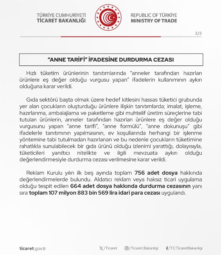 Bu arada hızlı tüketim ürünlerinin tanıtımlarında “anneler tarafından hazırlan ürünlere eş değer olduğu vurgusu yapan” ifadelerin kullanımının aykırı olduğuna karar verildi.